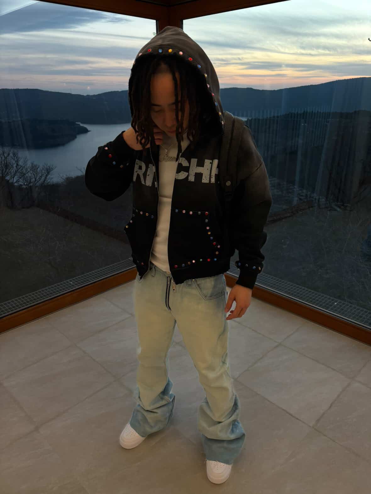 Color-Black Material-Cotton100% 【S-size】 着丈/60cm 身幅/61.5cm 肩幅/60cm 袖丈/56cm 【M-size】 着丈/62cm 身幅/64cm 肩幅/62.5cm 袖丈/57cm 【L-size】 着丈/64cm 身幅/66.5cm 肩幅/65cm 袖丈/58cm 何気ない日常さえ、この一着で物語に変わる。 スタッズが外れたとしても、それすら味になる。 壊れて完成する、型にはまらないスタイル。 (注意事項) ・本製品のスタッズは、無骨さや個体差を含めたデザインの一部です。そのため、スタッズの外れを理由とした返品・返金・交換は対応しておりません。不完全さも含めて、唯一無二の一着としてお楽しみください。 ・製品加工の特性上、色味や風合いに個体差があります。 ・スタッズ部分は強い摩擦や引っ掛かりにご注意ください。